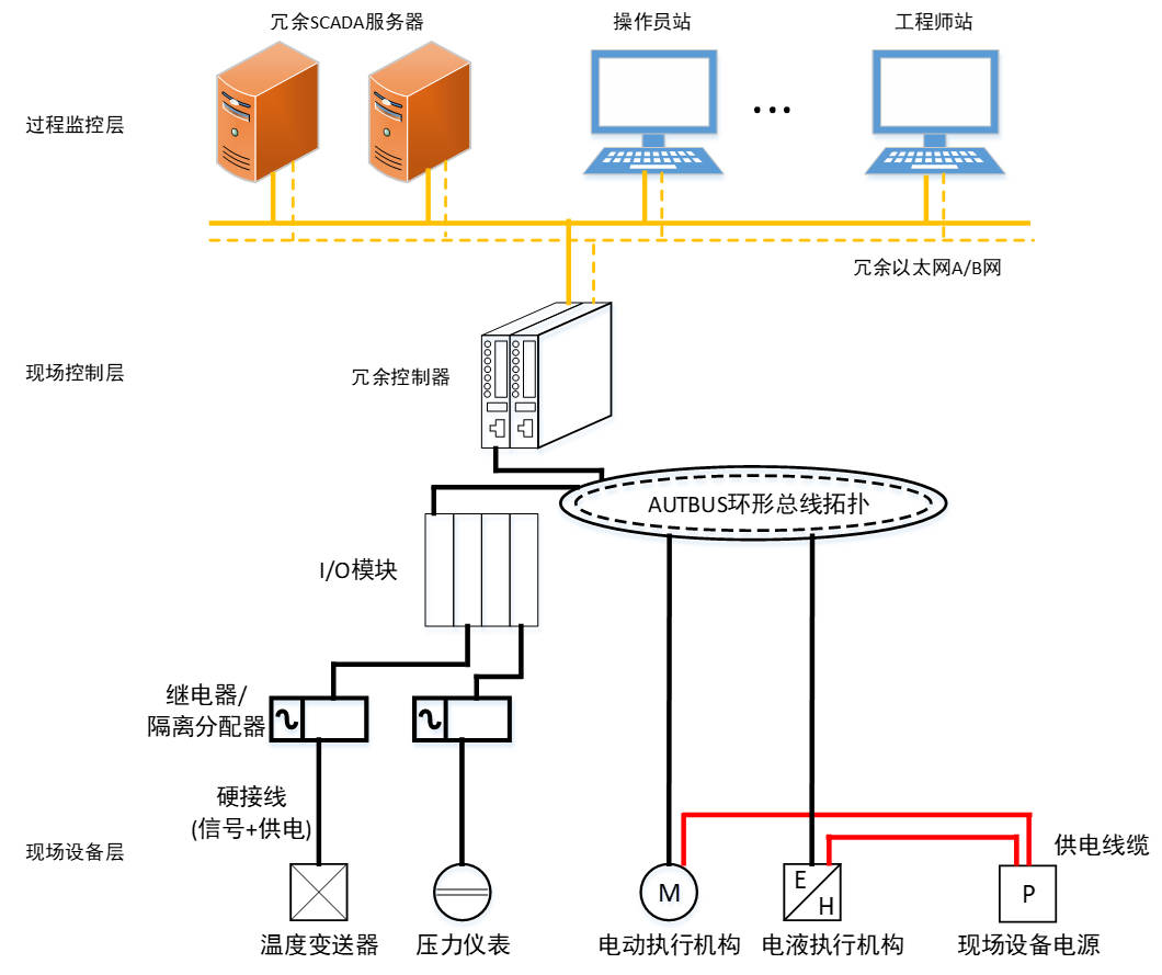 ? ? ? ? 基于AUTBUS總線構(gòu)建高可靠場站監(jiān)控系統(tǒng),采用冗余控制器、雙環(huán)網(wǎng)架構(gòu)及多級(jí)冗余設(shè)計(jì)(電源、網(wǎng)絡(luò)、服務(wù)器),實(shí)現(xiàn)現(xiàn)場控制層與SCADA系統(tǒng)的無縫對接;通過AUTBUS總線直連執(zhí)行機(jī)構(gòu)與IO模塊,集成天然氣調(diào)壓、分輸計(jì)量、閥門控制(開閉/開度調(diào)節(jié))、多參數(shù)監(jiān)測(壓力、溫度、流量、液位)、安全泄放及儀表標(biāo)定功能,形成“數(shù)據(jù)采集-指令下發(fā)-安全保護(hù)”全鏈路控制能力,滿足管道運(yùn)行狀態(tài)實(shí)時(shí)感知、智能診斷與精準(zhǔn)調(diào)控需求,打造“高可用、強(qiáng)容錯(cuò)、全閉環(huán)”的智能監(jiān)控生態(tài)。